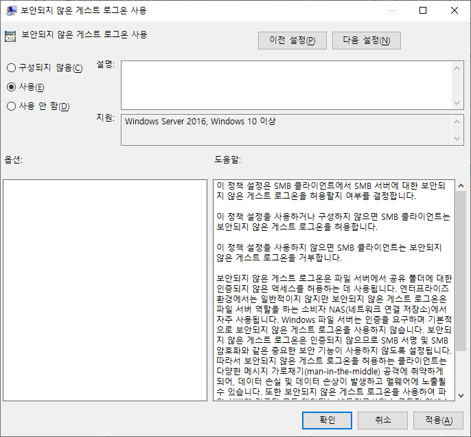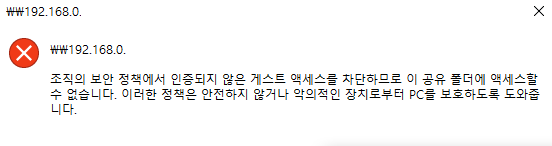 탐색기>네트워크에서 다른 PC를 더블 클릭하면 정상이라면 공유문서, (사용자명) 이렇게 두 개의 폴더가 뜨면서 들어가져야 하는데 같은 망 내에 있음에도 불구하고 한 쪽에서는 접근이 가능한데 위와 같은 오류와 함께 다른 한 쪽에서는 접근이 불가능한 경우가 있었다.